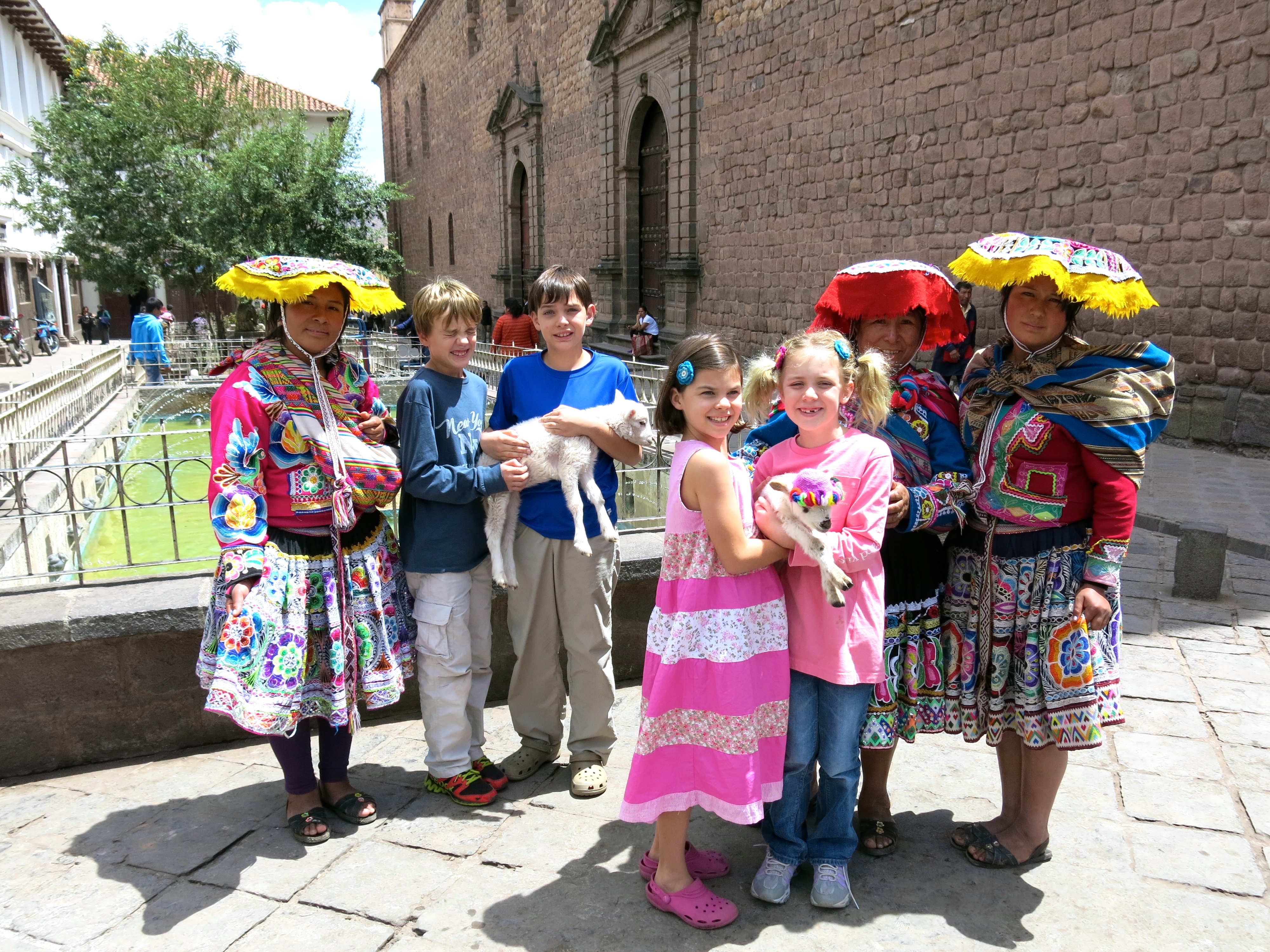 11/18/14 – In Santiago there were mountains all around the city. We did a whole bunch of homework and walked to the mall a few times. The mall was huge and there was a giant Christmas tree in the middle and a water show near some palm trees. Santiago felt really good because it was the perfect temperature. That was all there was really to talk about in Santiago. Next we went to Lima, Peru which is on a cliff. I felt like it could fall down. We ate on the top floor and one night there was an earthquake. We went to a playground near the mall. We saw some dogs and there was a park with a lot of flower beds with cats lying in them. We also went to Dunkin Doughnuts and I got a pink donut with rainbow sprinkles. Now we are in Cusco, Peru and we are about 11,000 feet high. In 4 days we’re meeting Drew and Avery and we are going with them to Machu Piccu. Cusco is kind of an old city with narrow streets.